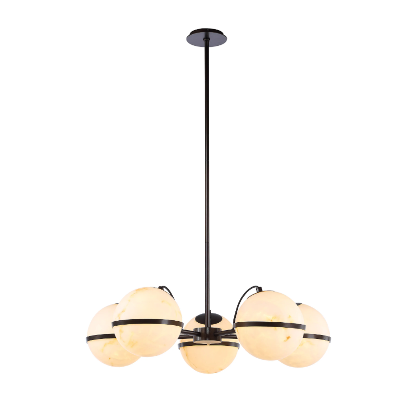 Add luxurious character to a dining room, living room or entryway with this stunning ceiling fixture from Steven Sabados. The Canadian television host and designer conceived this light with a clean spun architectural silhouette, dark antique bronze finish and five faux alabaster globes that light up to reveal rich veining for a textured look and warm glow throughout any modern space.