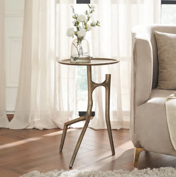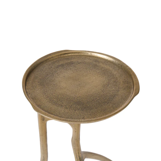 Avec sa silhouette sculpturale, cette magnifique table d’appoint affirme une présence artistique qui captive le regard dans tout intérieur. Fabriquée en aluminium moulé pour une sensation de grande qualité, sa finition en laiton antique lui confère une patine élégante, alliant charme d’antan et modernité, et apportant style et fonctionnalité aux espaces contemporains et de style transitionnel.