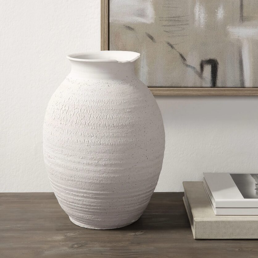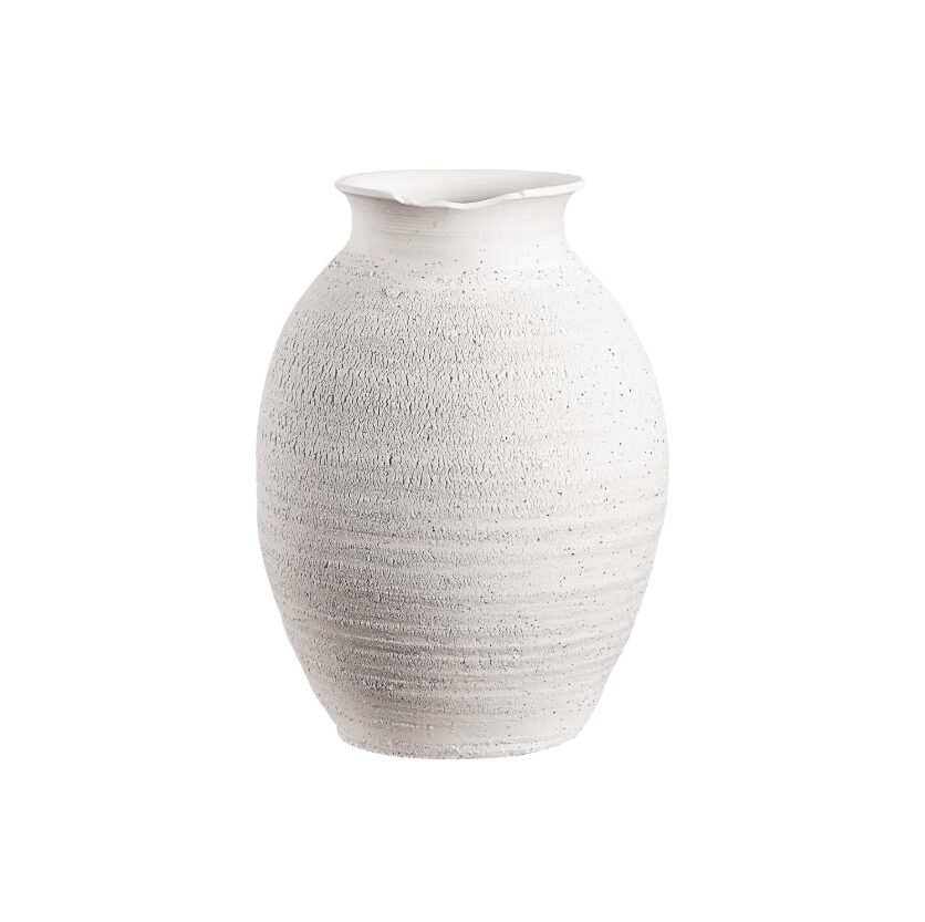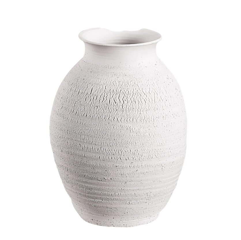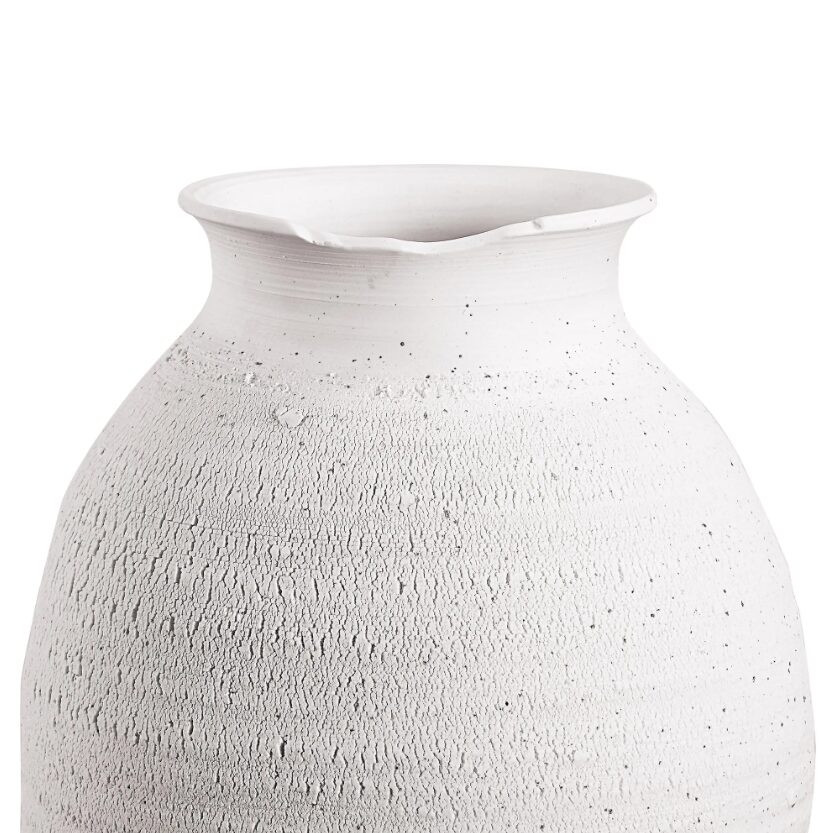 La lumière projetant des reflets et des ombres sur ce vase le rend encore plus enchanteur. Sa structure en céramique et sa finition blanc mat lui confèrent une allure intemporelle qui lui permet de s’intégrer à une variété de styles d’intérieur. Grâce à sa structure large, cet accessoire permet d’y placer de somptueuses compositions florales, allant de l’eucalyptus et des saules à la lavande et aux fleurs artificielles.